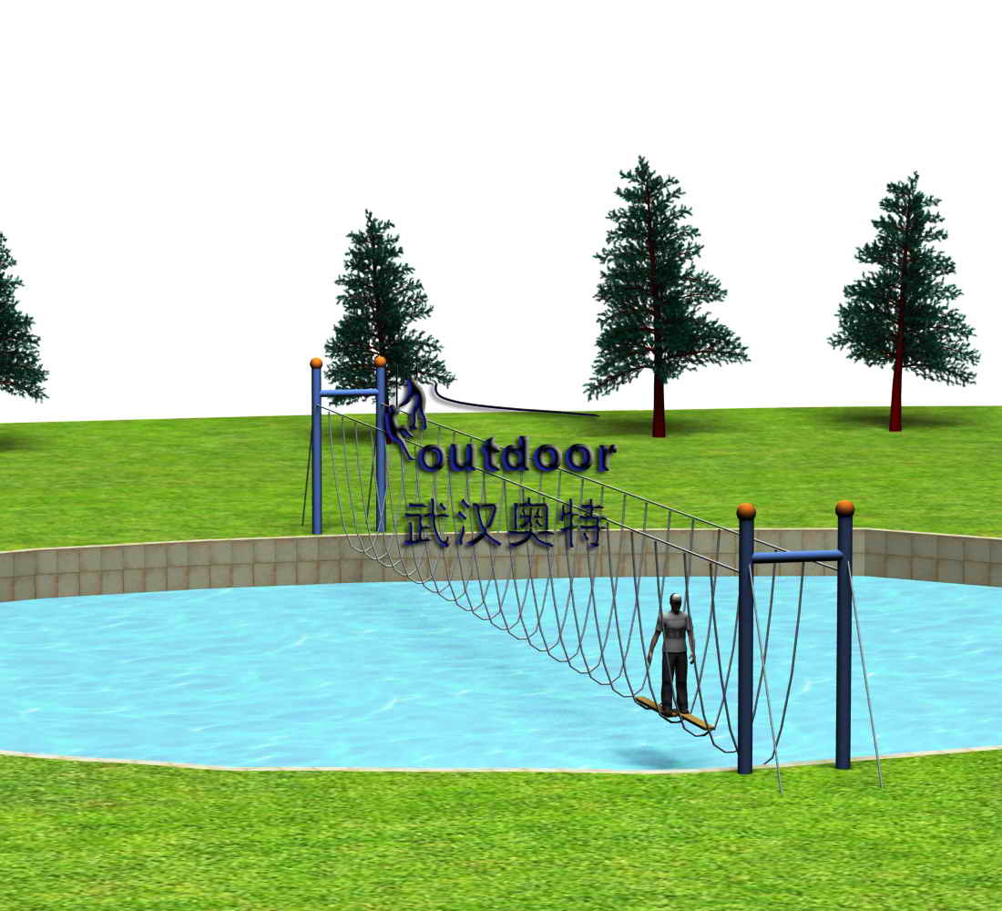 娛樂器材產(chǎn)品介紹:參與者需要通過兩塊木板,穿越垂吊鋼纜的趣味橋。