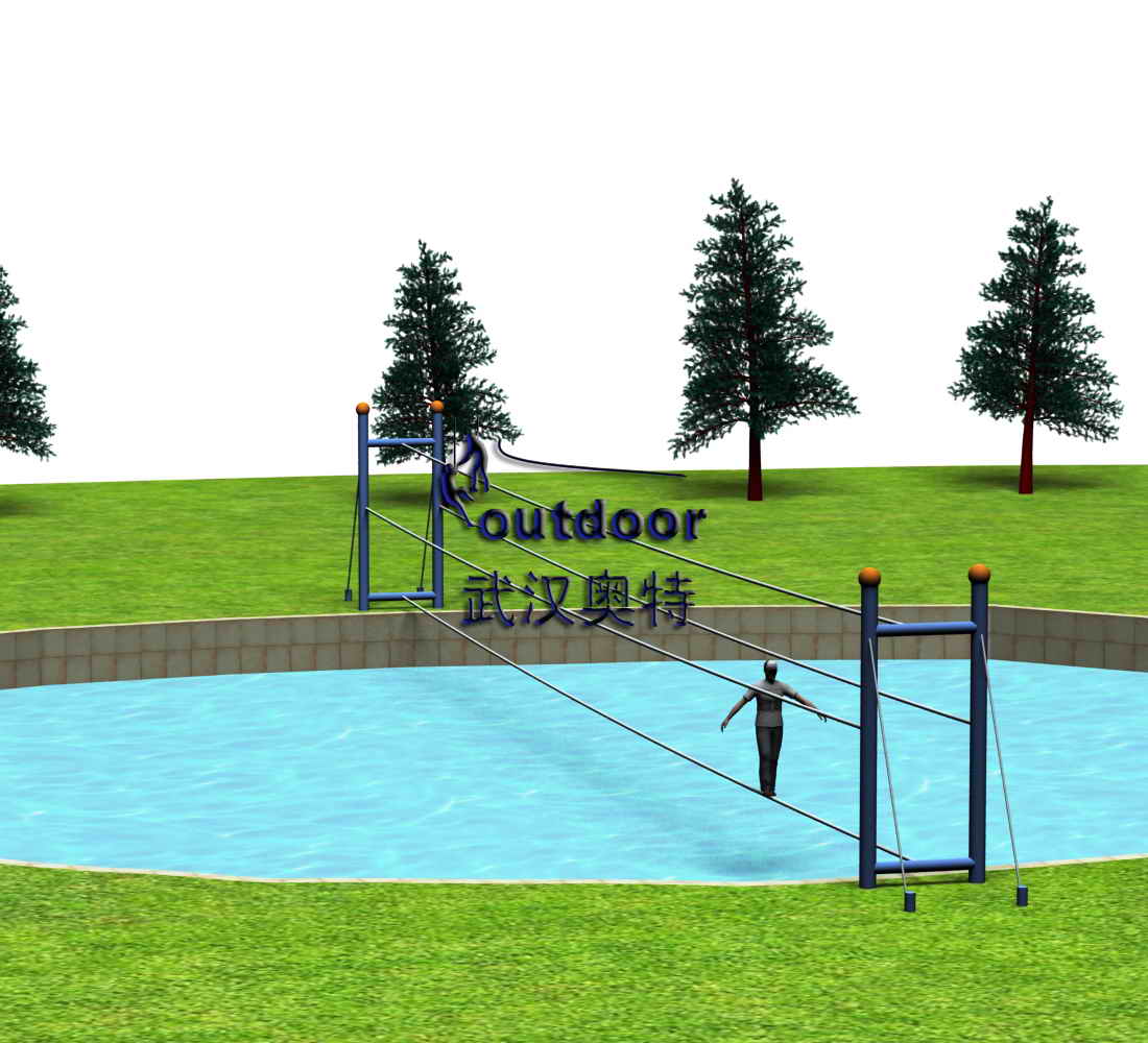 娛樂器材產(chǎn)品介紹:參與者腳踩鋼纜,雙手扶著保護(hù)繩,穿越水上簡(jiǎn)易的橋面